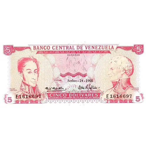(Translation: Central Bank of Venezuela Caracas April 29th 1969 5 Bolivars Payable to the bearer at the bank offices)