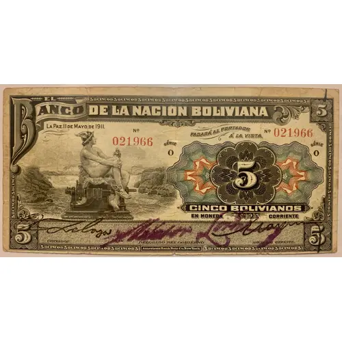 (Translation: The Bank of the Bolivian Nation La Paz, May 11th., 1911 Will pay to the bearer at sight 5 five Bolivianos in coin currency)