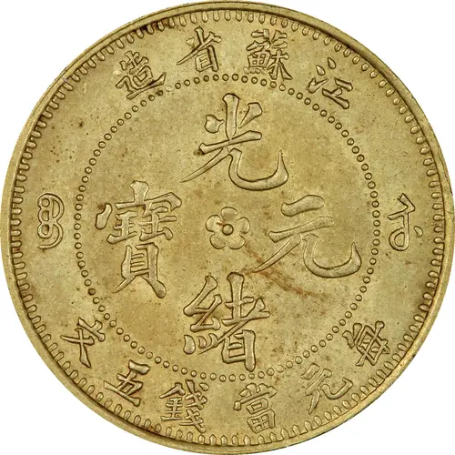造省蘇江 ᠪᠣᠣ ᠰᡠ 光 寶元 緒 文五錢當元毎 (Translation: Made in Kiangsu Province Boo-su (mint) Guangxu (Emperor) / Yuanbao (Original currency) Each piece worth 5 Cash) |