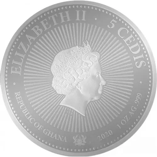 | نوشتههای روی سکه | ELIZABETH II • 5 CEDIS • REPUBLIC OF GHANA 2020 1 OZ AG .999 • |