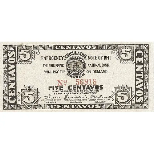 | Obverse lettering | EMERGENCY CIRCULATING NOTE OF 1941 THE PHILIPPINE NATIONAL BANK WILL PAY THE BEARER ON DEMAND FIVE CENTAVOS IN LAWFULL CURRENCY OF THE PHILIPPINES CEBU CURRENCY COMMITTEE |