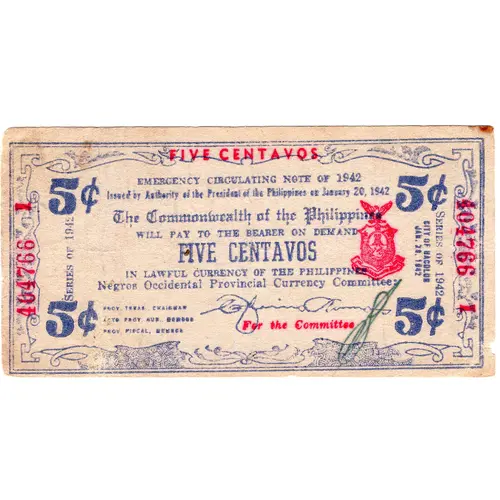 Obverse lettering FIVE CENTAVOS EMERGENCY CIRCULATING NOTE OF 1942 ISSUED BY AUTHORITY OF THE PRESIDENT OF THE PHILIPPINES ON JANUARY 20, 1942 THE COMMONWEALTH OF THE PHILIPPINES WILL PAY TO THE BEARER ON DEMAND FIVE CENTAVOS IN LAWFUL CURRENCY OF THE PHILIPPINES NEGROS OCCIDENTAL PROVINCIAL CURRENCY BOARD