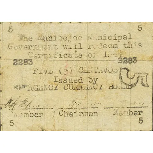 | Obverse lettering | THE MARIBOJOC PROVINCIAL GOVERNMENT WILL REDEEM THIS CERTIFICATE OF 1944 FIVE (5) CENTAVOS ISSUED BY EMERGENCY CURRENCY BOARD |