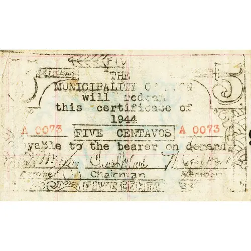 | Obverse lettering | FIVE CENTAVOS THE MUNICIPALITY OF LOON WIL REDEEM THIS CERTIFICATE OF 1944 FIVE CENTAVOS PAYABLE TO THE BEARER ON DEMAND |