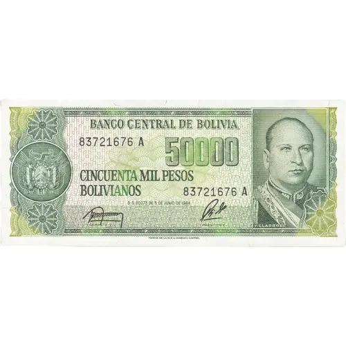 | Obverse lettering | BANCO CENTRAL DE BOLIVIA 50000 CINCUENTA MIL PESOS BOLIVIANOS D.S. 20273 DE 8 DE JUNIO DE 1984 VILLAROEL (Translation: Central Bank of Bolivia 50,000 Fifty thousand Pesos Bolivianos D. S. (Supreme Decree) from June 8th., 1984 Villaroel) |