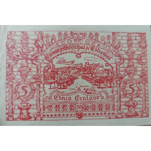| Obverse lettering | Camara Municipal de Estremoz 5 Centavos 1921 (Translation: Estremoz City Council 5 Cents) |