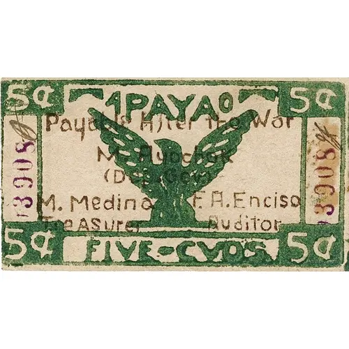 | Obverse lettering | APAYAO Payable After the War M. Ayochok (Dep. Gov) M. Medina F. A. Enciso Treasurer Auditor FIVE - CVOS 5¢ |