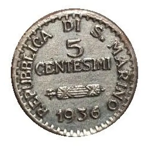 | Obverse lettering | REPUBBLICA DI S.MARINO 1936 5 CENTESIMI |