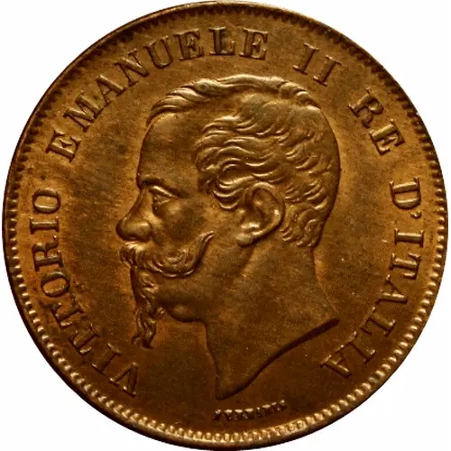 Obverse description Head of King Vittorio Emanuele II left and the name of the engraver below the neck