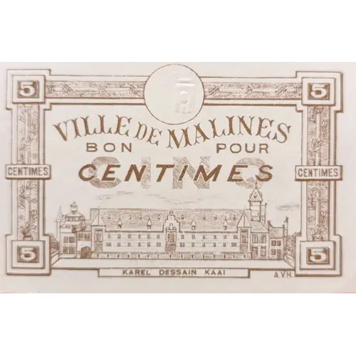 | Надписи лицевой стороны | VILLE DE MALINES - BON POUR 10 CENTIMES - KAREL DESSAIN KAAI (Translation: CITY OF MECHELEN - GOOD FOR 10 CENTS - KAREL DESSAIN QUAY) |