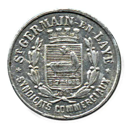| Obverse description | Legend follows the perimeter with Stars between words near center. Coat of Arms of Coat of arms Saint-Germain-en-Laye.svg at center with mint name below. Wreath of olive branches go around the sides of the coat of arms. |