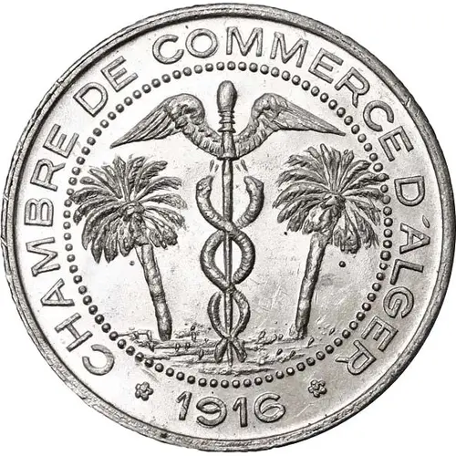 | Obverse description | In the center of the coin a winged caduceus with 2 snakes and 2 palm trees On the crown: CHAMBER OF COMMERCE OF ALGIERS and the date of issue |