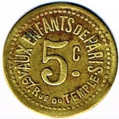 | Obverse lettering | AUX ENFANTS de PARIS 5 c 167. Rue du Temple |