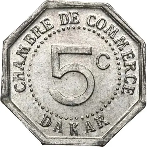 Artistry: The design of this 5 Centimes piece is characteristic of colonial necessity coinage: functional and direct rather than elaborately artistic. While a specific engraver is typically unrecorded for such issues, the stylistic school is utilitarian, prioritizing clarity of denomination and issuing authority. The obverse prominently features the legend "CHAMBRE DE COMMERCE DE DAKAR" and the denomination, often within a simple decorative motif. The reverse typically displays the date and denomination, sometimes encircled by a wreath or a basic geometric pattern, reflecting a practical aesthetic devoid of the complex allegorical figures found on metropolitan French coinage.