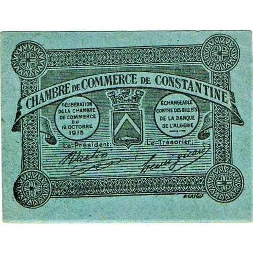 | Obverse lettering | CHAMBRE DE COMMERCE DE CONSTANTINE Délibération de la Chambre de Commerce du 12 octobre 1915 Echangeable contre des billets de la Banque de France Le Président Le Trésorier A CAYEUX |