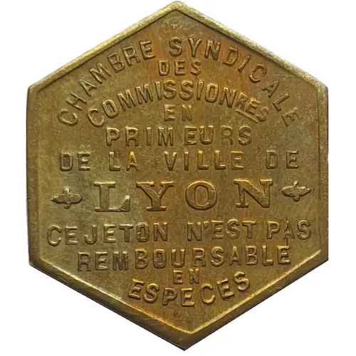 | Obverse lettering | CHAMBRE SYNDICALE DES COMMISSIONres EN PRIMEURS DE LA VILLE DE LYON CE JETON N`EST PAS REMBOURSABLE EN ESPECES |