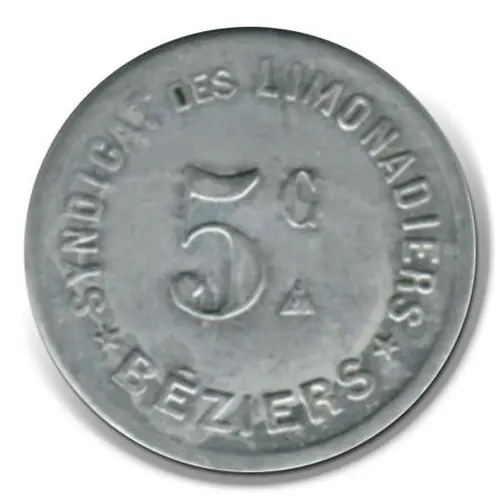 | Obverse lettering | SYNDICAT DES LIMONADIERS BEZIERS 5 c |