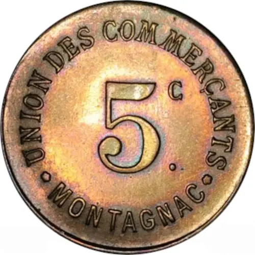 | Obverse lettering | UNION DES COMMERÇANTS 5c. * MONTAGNAC * |