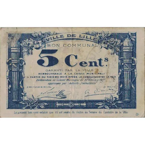 VILLE DE LILLE BON COMMUNAL 5 Cents. GARANTI PAR LA VILLE REMBOURSABLE A LA CAISSE MUNICIPALE A PARTIR DU SIXIÈME MOIS APRÈS LA CONCLUSION DE LA PAIX Délibération du Conseil Municipal du 31 Octobre 1917 approuvée par l`Autorité Préfectorale LE RECEVEUR MUNICIPAL LE MAIRE Le présent bon n`est valable que s`il est revêtu du timbre du Service du Contrôle de la Ville |