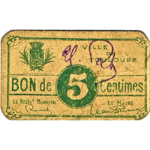 | Obverse lettering | VILLE DE TOULOUSE BON DE 5 CENTIMES Le Receve. Municipal Le Maire |