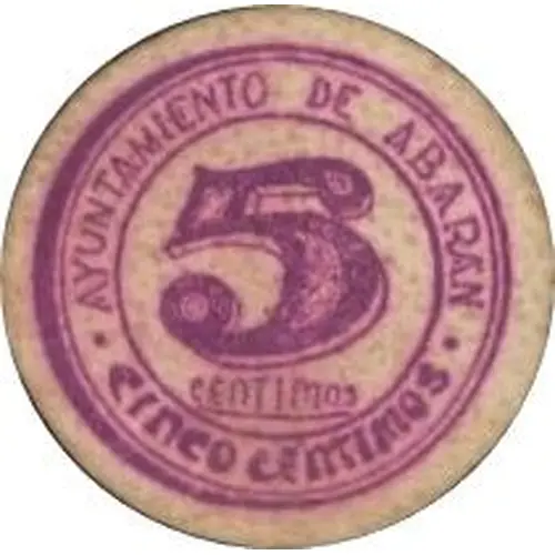 | Opschrift voorzijde | · AYUNTAMIENTO DE ABARÁN · 5 centimos cinco centimos (Translation: City Council of Abarán 5 Centimos Five Centimos) |