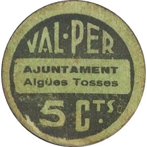 VAL · PER 5 CTS. AJUNTAMENT Aigües Tosses (Translation: Valid for 5 Centimos City Council Aigües Tosses) |