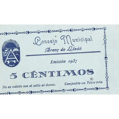 Consejo Municipal Arens de LLedó Emisión 1937 5 CÉNTIMOS No es válido sin el sello al dorso. Canjeable en Tesorería (Translation: Municipal Council Arens de LLedó Issue 1937 5 Centimos Not valid without stamp on back. Redeemable in Treasury) |