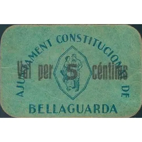 AJUNTAMENT CONSTITUCIONAL DE BELLAGUARDA Val per 5 cèntims (Translation: Constitutional City Council of Bellaguarda Valid for 5 Centimos) |