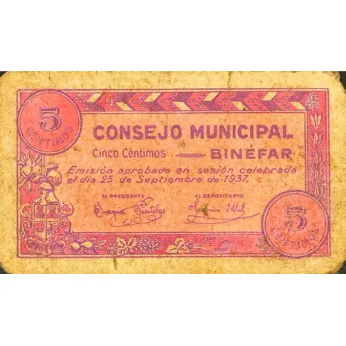 5 CÉNTIMOS CONSEJO MUNICIPAL BINÉFAR Cinco Centimos Emisión aprobada en sesión celebrada el dia 25 de Septiembre de 1937. (Translation: Municipal Council of Binefar Five Centimos Issue approved in session held on September 25, 1937.) |