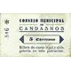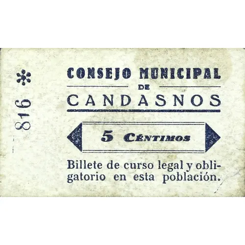 CONSEJO MUNICIPAL DE CANDASNOS 5 CÉNTIMOS Billete de curso legal y obligatorio en esta población. (Translation: Municipal Council of Candasnos 5 Centimos Legal and mandatory tender note in this town.) |