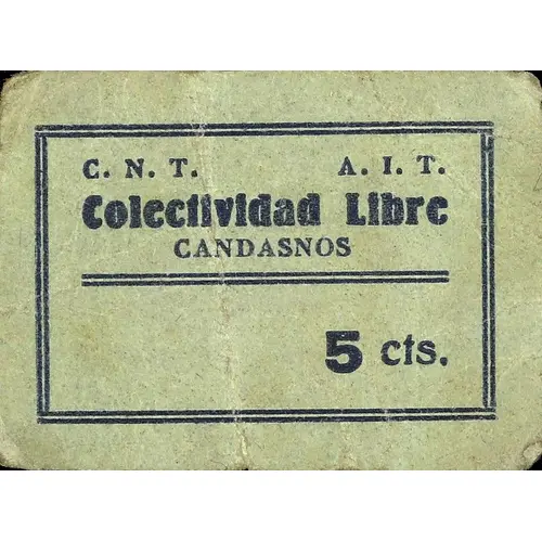 C. N. T. A. I. T. Colectividad Libre CANDASNOS 5 cts. (Translation: Free Collectivity Candasnos 5 Centimos) |