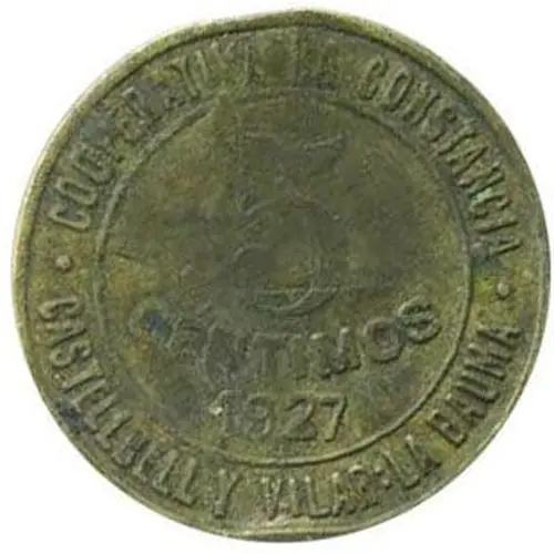 | Obverse lettering | COOPERATIVA LA CONSTANCIA 5 CÉNTIMOS 1927 CASTELLBELL Y VILAR: LA BAUMA |