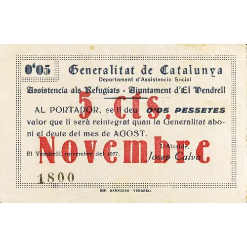 Vorderseitenlegende Generalitat de Catalunya / Departament d`Assistencia Social Assistencia als Refugiats = Ajuntament d`El Vendrell AL PORTADOR, se li deu 0`05 PESSETES valor que li serà reintegrat quan la Generalitat aboni el deute del mes de AGOST. El Vendrell, novembre del 1937 5 cts. / Novembre