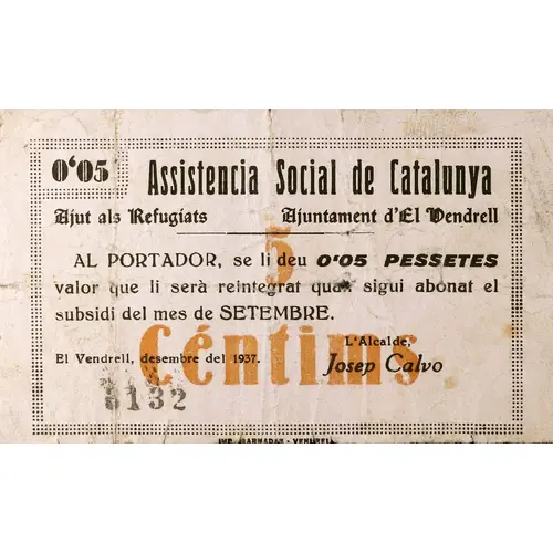 5 Céntims Assistencia Social de Catalunya Ajut als Refugiats Ajuntament d`El Vendrell AL PORTADOR, se li deu 0`05 PESSETES valor que li serà reintegrat quan sigui abonat el subsidi del mes de SETEMBRE. El Vendrell, desembre del 1938. (Translation: 5 Centimos Social Assistance of Catalonia Help for Refugees City Council of El Vendrell To the bearer, he is owed 0.05 Pesetas value which will be refunded when the allowance for the month of Setember is paid. El Vendrell, December 1937.) |