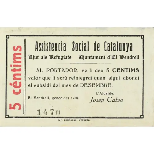 | Obverse lettering | 5 céntims Assistencia Social de Catalunya Ajut als Refugiats Ajuntament d`El Vendrell AL PORTADOR, se li deu 5 CENTIMS valor que li serà reintegrat quan sigui abonat el subsidi del mes de DESEMBRE. El Vendrell, gener del 1938. (Translation: 5 Centimos Social Assistance of Catalonia Help for Refugees City Council of El Vendrell To the bearer, he is owed 5 Centimos value which will be refunded when the allowance for the month of December is paid. El Vendrell, January 1938.) |