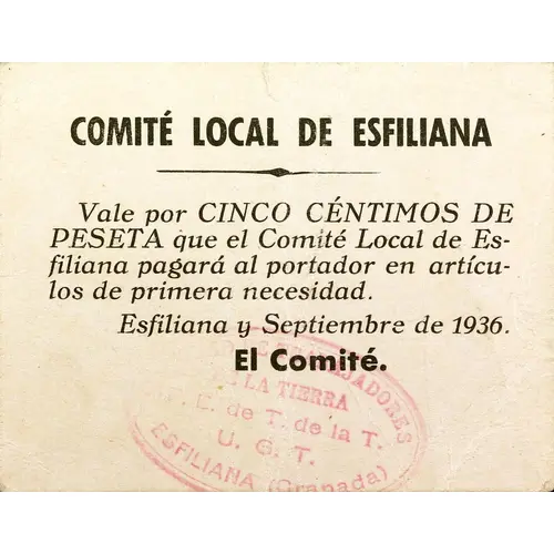 COMITÉ LOCAL DE ESFILIANA Vale por CINCO CÉNTIMOS DE PESETA que el Comité Local de Esfiliana pagará al portador en artículos de primera necesidad. Esfiliana y Septiembre de 1936. El Comité. (Translation: Local Committee of Esfiliana It is worth Five Centimos of a Peseta that the Local Committee of Esfiliana will pay to the bearer in basic necessities. Esfiliana and September 1936. The Committee.) |
