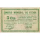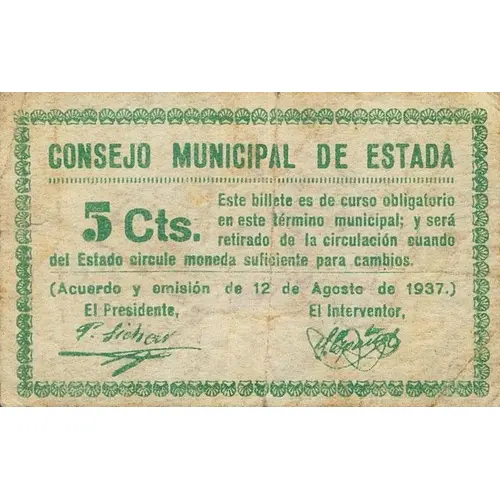 CONSEJO MUNICIPAL DE ESTADA 5 Cts. Este billete es de curso obligatorio en este término municipal; y será retirado de la circulación cuando del Estado circule moneda suficiente para cambios. (Acuerdo y emisión de 12 de Agosto de 1937.) (Translation: Municipal Council of Estada 5 Centimos This banknote is mandatory course in this municipal term; and it will be withdrawn from circulation when from the State circulates enough currency for exchange. (Agreement and issue of August 12, 1937.)) |