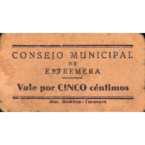 | Obverse lettering | CONSEJO MUNICIPAL DE ESTREMERA Vale por CINCO céntimos Imp. Ramírez. - Tarancón (Translation: Municipal Council of Estremera Voucher for Five Centimos) |