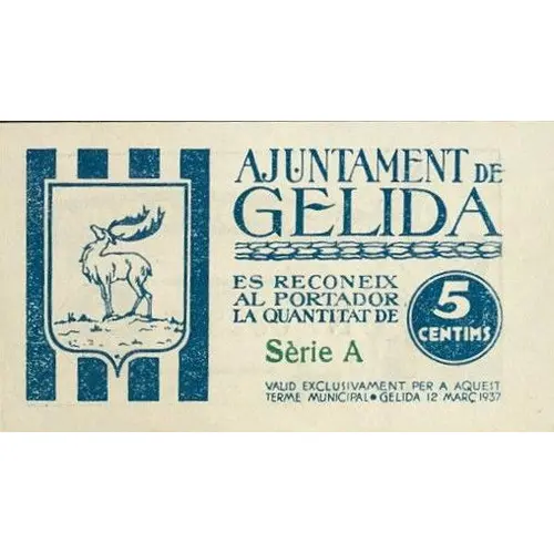 AJUNTAMENT DE GELIDA ES RECONEIX AL PORTADOR LA QUANTITAT DE 5 CENTIMS VALID EXCUSIVAMENT PER AQUEST TERME MUNICIPAL GELIDA 12 MARÇ 1937 (Translation: City Council of Gelida The bearer is recognized by the amount of 5 Centimos Valid exclusively for this municipal term Gelida March 12, 1937) |