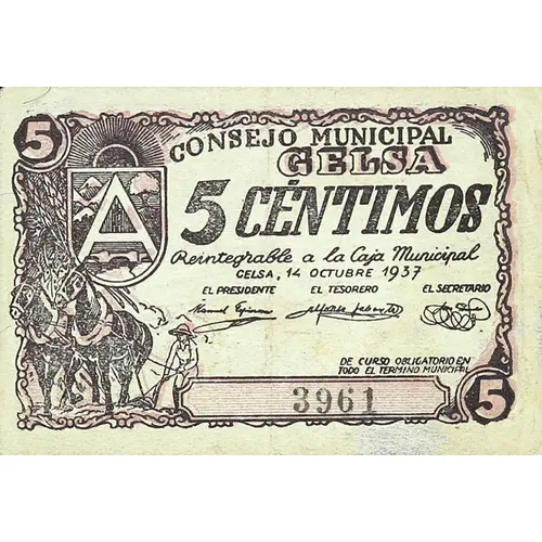 CONSEJO MUNICIPAL DE GELSA 5 CÉNTIMOS Reintegrable a la Caja Municipal GELSA, 14 OCTUBRE 1937 DE CURSO OBLIGATORIO EN TODO EL TERMINO MUNICIPAL (Translation: Municipal Council of Gelsa 5 Centimos Reimbursable to the Municipal Fund Gelsa, October 14, 1937 Mandatory course throughout the Municipal Term) |