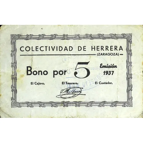 COLECTIVIDAD DE HERRERA (ZARAGOZA) Bono por 5 Emisión 1937 (Translation: Collectivity of Herrera (Zaragoza) Bond for 5 Issue 1937) |