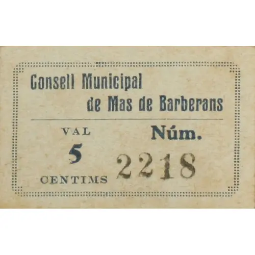 | Obverse lettering | Consell Municipal de Mas de Barberans VAL 5 CENTIMS (Translation: Municipal Council of Mas de Barberans It`s worth 5 Centimos) |