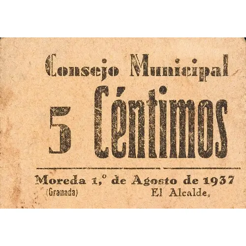 Consejo Municipal 5 Céntimos Moreda (Granada) 1.º de Agosto de 1937 (Translation: Municipal Council 5 Centimos Moreda (Granada) August 1, 1937.) |