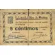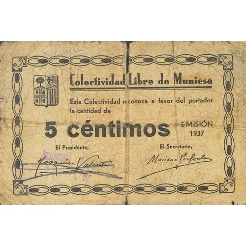 Colectividad Libre de Muniesa Esta Colectividad reconoce a favor del portador la cantidad de 5 céntimos EMISIÓN 1937 (Translation: Free Collectivity of Muniesa This Collectivity recognizes in favor of the bearer the amount of 5 Centimos Issue 1937) |