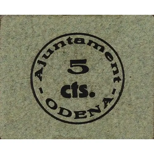 Ajuntament ODENA 5 cts. (Translation: City Council Odena 5 Centimos) |