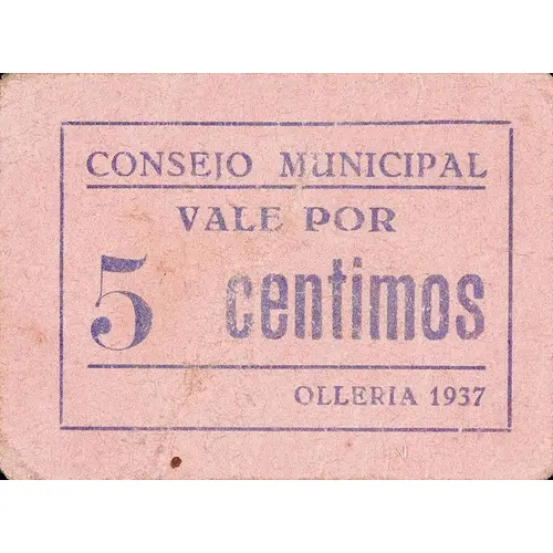 CONSEJO MUNICIPAL VALE POR 5 centimos OLLERIA 1937 (Translation: Municipal Council Valid for 5 Centimos Olleria 1937) |