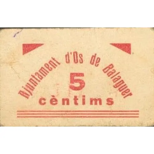 Ajuntament d`Os de Balaguer 5 cèntims (Translation: City Council of Os de Balaguer 5 Centimos) |