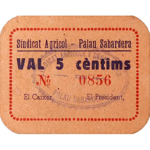 Sindicat Agrícol - Palau Sabardera VAL 5 cèntims N.º 0856 El Caixer, El President (Translation: Agricultural Union Palau Sabardera It`s worth 5 Centimos The Cashier, The President) |