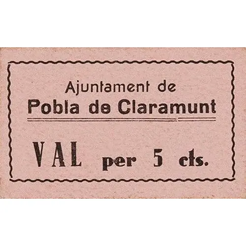 Ajuntament de Pobla de Claramunt VAL per 5 cts. (Translation: City Council of Pobla de Claramunt Voucher for 5 Centimos) |