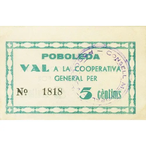 POBOLEDA VALE A LA COOPERATIVA GENERAL POR 5 céntimos (Translation: Poboleda Voucher in the General Cooperative for 5 Centimos) |